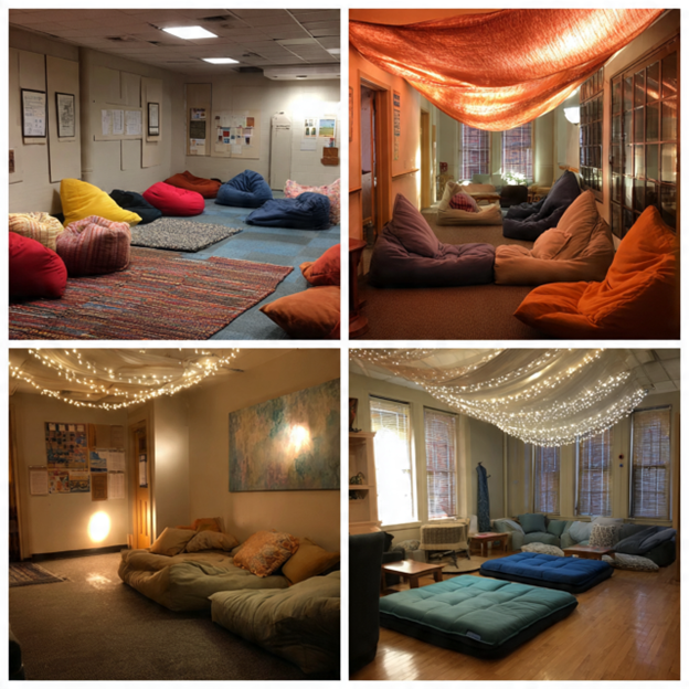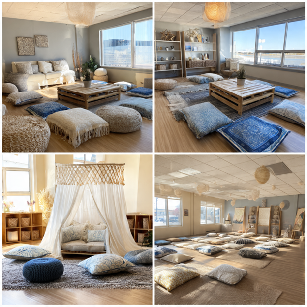- Mindfulness & Meditation Corners – Grounding spaces designed for reflection and self-regulation.